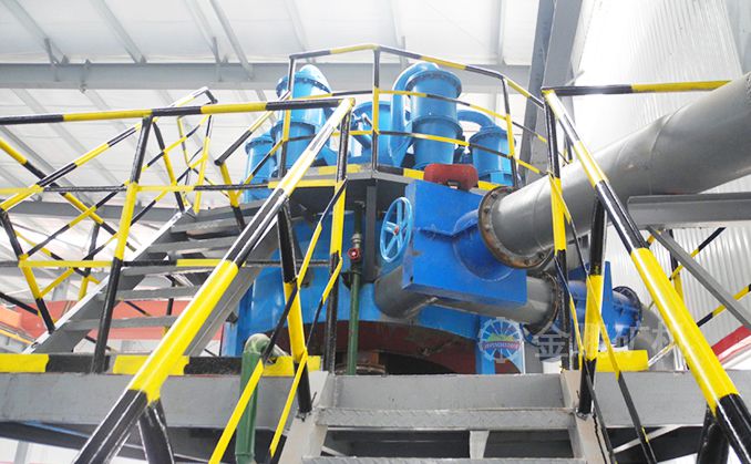 该流程的特点是:原矿一次磨矿后经水力旋流器分级,粗粒级和细粒级分别处理;粗粒级采用螺旋溜槽重选,及时获得粗粒合格精矿;细粒级采用弱磁-强磁-反浮选;确保获得好的选别指标和高品位的细粒精矿;重选中矿二次磨矿,返回旋流器分级作业。全流程的精矿粒度组成主要以重选粗粒精 矿为主,反浮选碱性细粒精矿量较小,不像连续磨矿-弱磁-强磁一反浮选流程容易引起过滤困难。